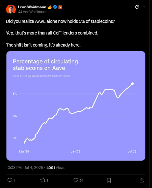 Pada Jumat, 11 Juli, AAVE naik 6% mencapai level harian $317.58, memperkuat kenaikan mingguan dari harga sebelumnya $272. Lonjakan ini juga didorong oleh meningkatnya adopsi stablecoin di platform Aave, yang kini menguasai 5% dari total pasokan stablecoin yang beredar dalam pinjaman. Angka ini menempatkan Aave jauh di depan semua pemberi pinjaman CeFi gabungan, menandakan daya tarik pinjaman terdesentralisasi yang kian meningkat.
