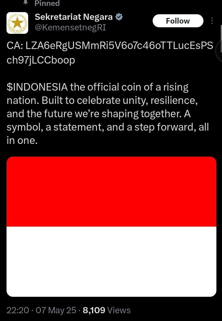 Rabu, 7 Mei 2025 – Diduga terkena hack, Akun sosial media X resmi milik Kementrian Sekertariat Negara (@KemensetnegRI) memposting dan mempin postingan memecoin $INDONESIA pada pukul 22.20 WIB tanggal 7 Mei 2025. Postingan tersebut lengkap berisikan ticker, deskripsi singkat tentang memecoin $INDONESIA lengkap dengan contract address atau CA-nya dan juga gambar merah putih sebagai medianya.