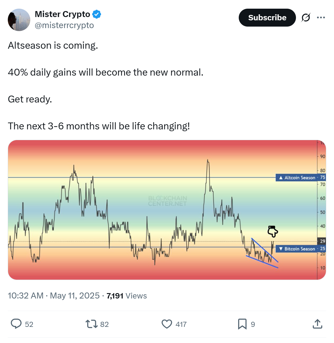 Komentator kripto Mister Crypto memperkirakan bahwa 3 hingga 6 bulan ke depan bisa menjadi periode yang “mengubah hidup,” menyarankan bahwa kenaikan harian hingga 40% mungkin akan segera menjadi normal.