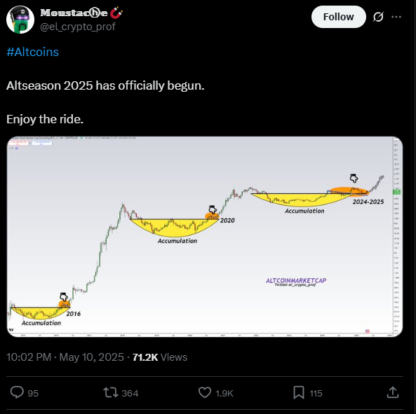 Ia membagikan grafik yang menunjukkan fase akumulasi altcoin berulang yang diikuti oleh pertumbuhan eksplosif. Menurutnya, struktur saat ini mencerminkan struktur tahun 2016 dan 2020. “Altseason 2025 secara resmi telah dimulai,” katanya.