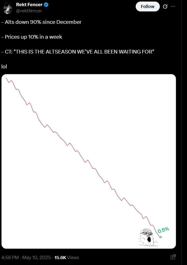 Namun, para skeptis tetap ada. Komentator Rekt Fencer menunjukkan bahwa sebagian besar altcoin telah turun 90% sejak Desember. Pantulan sederhana sebesar 10% minggu ini memicu optimisme yang berlebihan. “Inilah ALTSEASON yang kita semua tunggu-tunggu,” ujarnya bercanda.