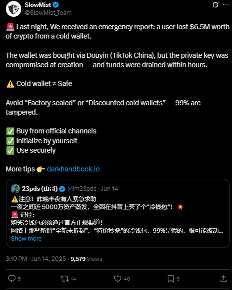 Seorang pengguna kripto dilaporkan kehilangan aset digital senilai $6,9 juta, setelah membeli dompet dingin (cold wallet) murah dari aplikasi Douyin, yang merupakan TikTok versi negara China, yang ternyata dompet/ cold wallet tersebut ternyata sudah dimodifikasi untuk mencuri aset sejak awal.