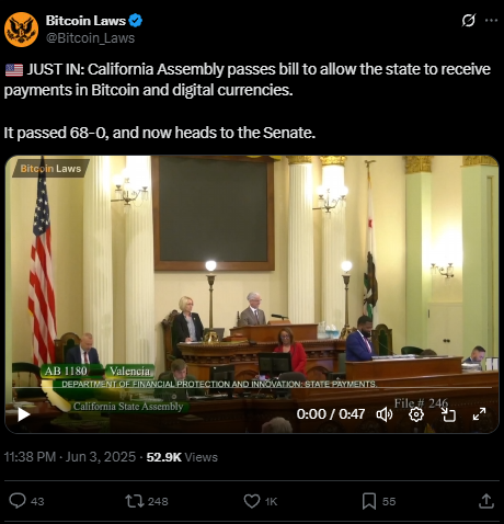 Negara Bagian California semakin dekat untuk mengadopsi kripto dalam sistem keuangannya setelah RUU AB 1180 disetujui secara bulat oleh Majelis Negara Bagian dengan suara 68-0. RUU ini kini menunggu persetujuan Senat sebelum dapat diresmikan menjadi undang-undang oleh Gubernur Gavin Newsom.