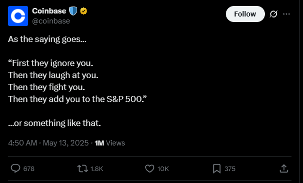 CEO Coinbase, Brian Armstrong, menyambut gembira momen ini melalui unggahan di X, menulis, “Kripto akan terus ada.” Perusahaan juga mengunggah cuitan jenaka: “Awalnya mereka mengabaikanmu, lalu menertawakanmu, kemudian melawanmu, dan akhirnya memasukkanmu ke S&P 500.”