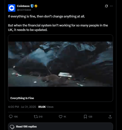 Coinbase meluncurkan video satir berjudul “Everything is fine” yang secara gamblang menyindir kondisi ekonomi Inggris yang sedang terpuruk. Video ini muncul di tengah data terbaru yang menunjukkan hampir separuh populasi dewasa di Inggris berada dalam kondisi rentan secara finansial. Dengan nada musikal yang sinis, video tersebut menggembar-gemborkan kekuatan finansial Inggris sambil menampilkan adegan-adegan suram inflasi, kemiskinan, utang, dan kesulitan finansial yang merefleksikan jurang antara retorika pemerintah dan realitas masyarakat.