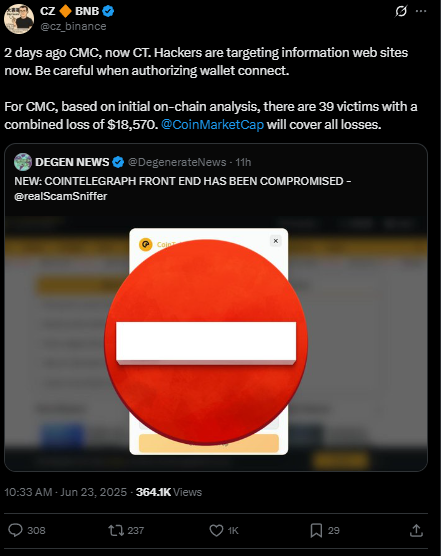 Changpeng Zhao (CZ), pendiri Binance, baru saja mengeluarkan peringatan mendesak kepada para pengguna kripto. Ia menyerukan kehati-hatian ekstra saat mengizinkan koneksi dompet digital, menyusul maraknya gelombang serangan phishing yang menargetkan situs web informasi kripto terkemuka. Peringatan ini muncul setelah insiden peretasan yang baru-baru ini menimpa media kripto Cointelegraph dan situs pelacak harga kripto populer, CoinMarketCap.