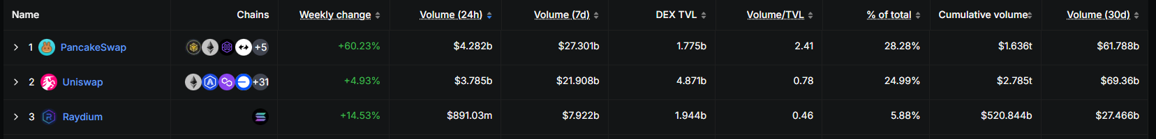 Berdasarkan data DeFiLlama, Uniswap mencatat volume perdagangan harian sebesar$4.28 miliar, sedangkan Bancor hanya sekitar $493 ribu.
