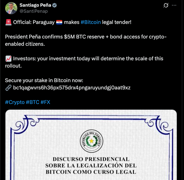 Pemerintah Paraguay membantah keras klaim yang menyebutkan bahwa negara tersebut telah menetapkan Bitcoin sebagai alat pembayaran yang sah. Pernyataan itu sebelumnya muncul dari akun pribadi Presiden Santiago Peña di platform X (dulu Twitter), yang menyebut Paraguay telah mengakui Bitcoin sebagai legal tender dan mendirikan cadangan BTC senilai $5 juta, lengkap dengan alamat dompet kripto bagi investor.