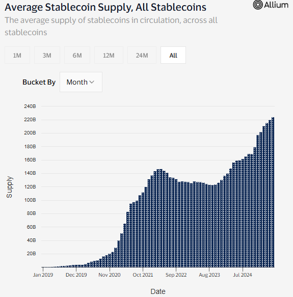 Pasar stablecoin terus menunjukkan pertumbuhan impresif, dengan total kapitalisasi pasar mencapai rekor tertinggi sebesar $243,8 miliar. Sejak awal tahun, nilai pasar stablecoin telah meningkat lebih dari $38 miliar.