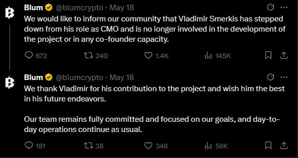 Meski demikian, Blum meyakinkan komunitasnya bahwa operasional dan pengembangan proyek akan tetap berjalan seperti biasa. Perusahaan juga menyampaikan rasa terima kasih atas kontribusi Smerkis selama masa jabatannya.