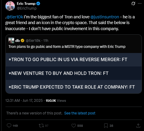 Eric Trump, putra mantan Presiden AS Donald Trump, mengaku sebagai penggemar berat proyek blockchain Tron dan pendirinya, Justin Sun. Namun, ia membantah kabar yang menyebut dirinya terlibat langsung dalam rencana Tron untuk melantai di bursa saham AS.