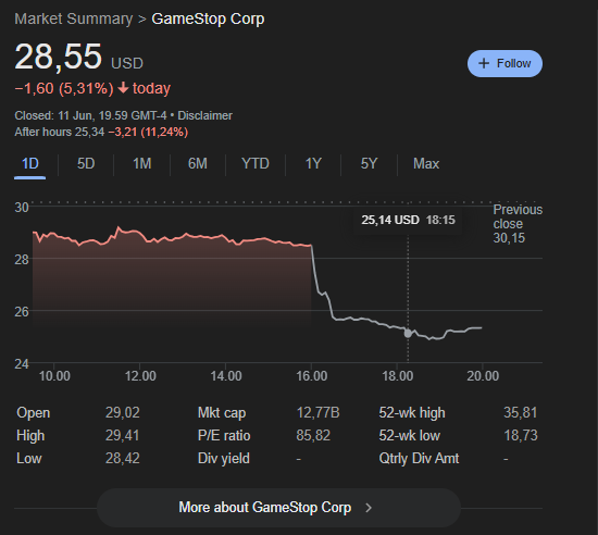 Penurunan saham GME kontras dengan tren sebagian besar perusahaan publik yang sahamnya justru naik setelah mengumumkan pembelian atau rencana investasi Bitcoin. Sejak GameStop mengkonfirmasi pembelian Bitcoin pertamanya pada 28 Mei, saham GME telah jatuh 18,5%. Dengan penurunan terbaru ini, seluruh keuntungan yang diperoleh GameStop sejak mengumumkan rencana investasi Bitcoin pada 25 Maret telah terhapus