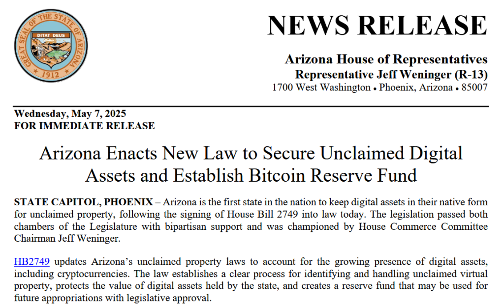 7 Mei 2025 – Gubernur Arizona, Katie Hobbs, telah menandatangani undang-undang yang memungkinkan negara bagian untuk mengklaim kepemilikan aset digital yang telah ditinggalkan selama minimal tiga tahun.