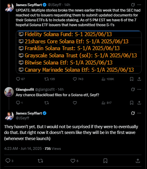 Sebanyak tujuh pelamar Exchange Traded Fund (ETF) Solana telah mengajukan pernyataan S-1 kepada Komisi Sekuritas dan Bursa (SEC) AS pada 13 Juni.