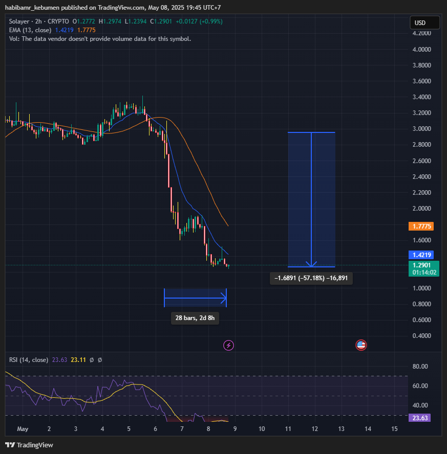 Saat ini, harga Solayer diperdagangkan di sekitar $1.28, kembali menguji zona support kunci antara $1.20 dan $1.30.