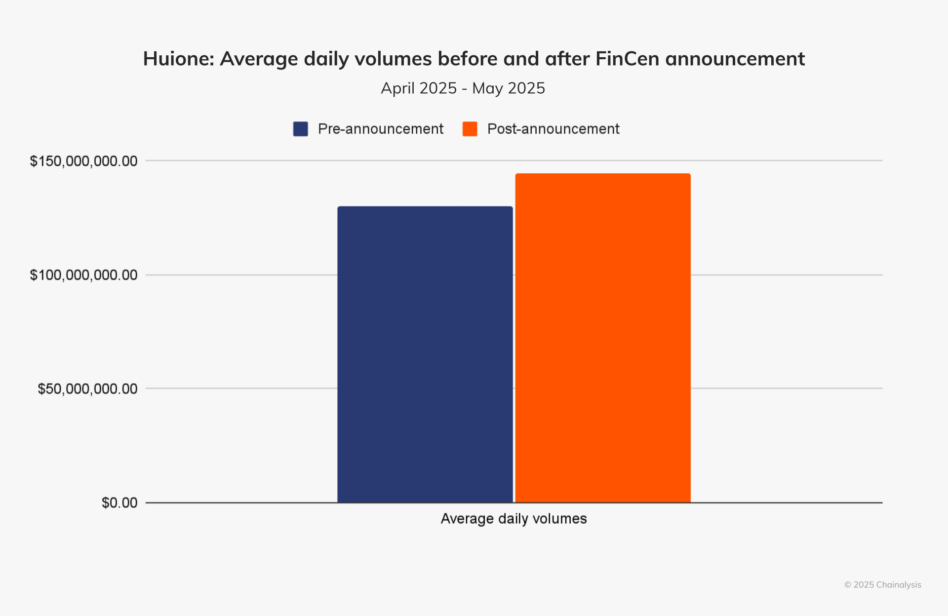 Meskipun biasanya bank-bank AS akan segera memutuskan hubungan untuk menghindari risiko regulasi, Huione terbukti sangat tangguh terhadap upaya otoritas. Chainalysis bahkan mencatat bahwa volume transaksi tidak hanya tidak menurun setelah pengumuman FinCEN, tetapi justru meningkat. Laporan TRM Labs pada 30 Mei juga menguatkan hal ini, menyatakan Huione Group masih mengoperasikan saluran untuk vendor VIP-nya dan telah menerima setidaknya $81 miliar dalam kripto sejak 2021, jauh melampaui pasar gelap Rusia, Hydra marketplace.