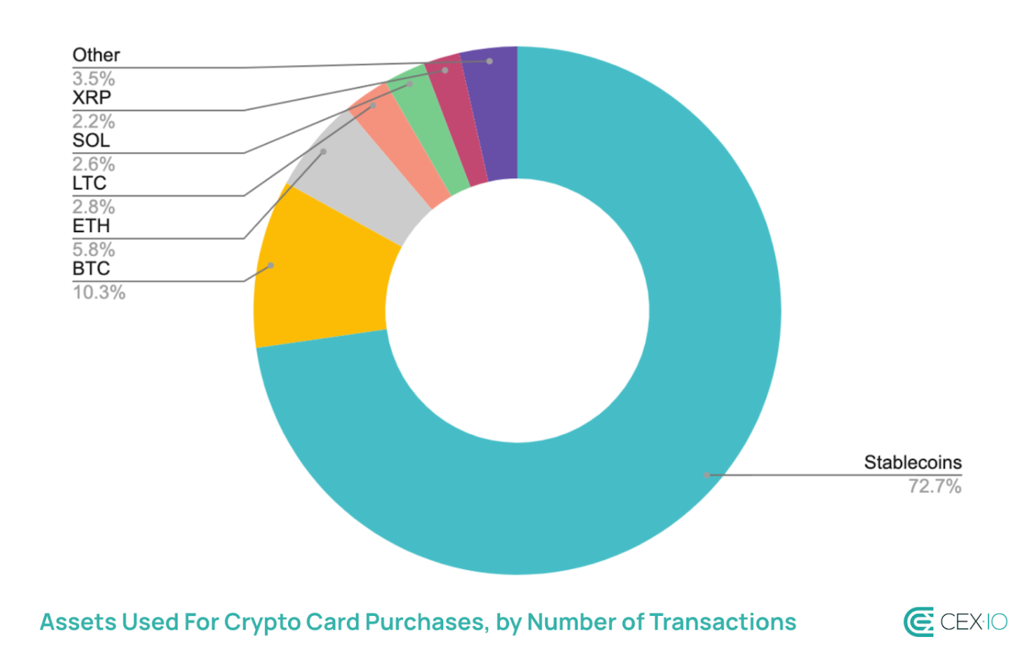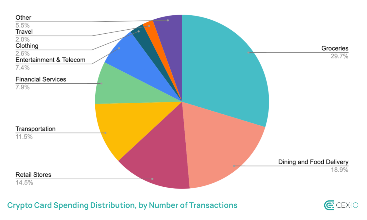 Meskipun data Bank Sentral Eropa menunjukkan hanya 21% dari seluruh pembayaran kartu di zona euro dilakukan secara online, angka CEX.IO menunjukkan pengguna kartu kripto telah melakukan 40% transaksinya di internet, hampir dua kali lipat rata-rata. Kartu kripto banyak digunakan untuk kebutuhan sehari-hari seperti belanja bahan makanan (59%) dan makan di restoran/kafe (19%). Nilai transaksi rata-rata kartu kripto adalah 23,7 euro, lebih rendah dibanding kartu bank yang mencapai 33,6 euro.