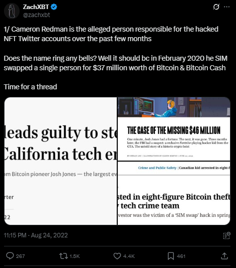 Kasus Redman kembali menjadi sorotan setelah keterlibatannya terendus dalam serangan phishing dan pembajakan akun X baru-baru ini, yang menargetkan beberapa proyek NFT. ZachXBT menilai, dengan nilai kejahatan sebesar ini, tak ada alasan nama Redman harus dilindungi.