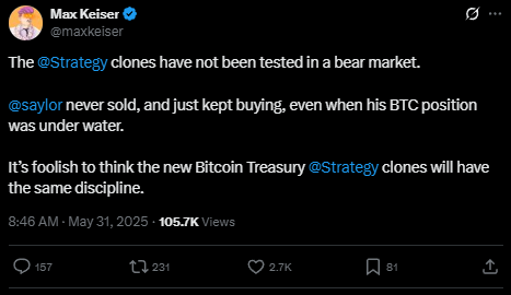 Dalam unggahan di platform X pada 30 Mei, Keiser menyatakan bahwa perusahaan-perusahaan baru yang meniru model Strategy belum memiliki disiplin yang sama. “Saylor tidak pernah menjual meski posisinya minus, sedangkan para peniru ini belum pernah melewati masa sulit yang sama,” tegasnya. Ia juga menekankan bahwa Strategy telah menjadi contoh utama dan simbol kekuatan dalam strategi treasury Bitcoin.