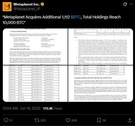 Perusahaan investasi asal Jepang, Metaplanet, resmi mencatatkan kepemilikan Bitcoin (BTC) sebanyak 10.000 BTC setelah pembelian terbarunya sebanyak 1.112 BTC senilai 16,88 miliar yen Jepang (sekitar $117 juta). Dengan tercatatnya rekor angka ini, Metaplanet kini resmi menyalip Coinbase sebagai perusahaan publik dengan cadangan Bitcoin terbesar ketujuh di dunia, mengalahkan simpanan Coinbase yang berada di angka 9.267 BTC.