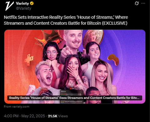 Netflix siap meluncurkan reality show terbaru berjudul House of Streams yang akan mempertemukan delapan streamer Twitch dalam serangkaian tantangan sengit untuk memperebutkan hadiah utama: satu Bitcoin (BTC), yang saat ini bernilai lebih dari $104.000 atau sekitar Rp1,6 miliar.