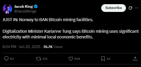 Menteri Digitalisasi Norwegia, Karianne Tung, menegaskan komitmen pemerintah untuk membatasi penambangan kripto karena dinilai sebagai penggunaan energi yang tidak berkelanjutan. Senada dengannya, Menteri Energi Terje Aasland menyatakan bahwa penambangan kripto tidak sesuai dengan tujuan iklim Norwegia, terutama karena konsumsi listriknya yang tinggi dan kontribusi nilai yang terbatas dalam hal penciptaan lapangan kerja atau investasi jangka panjang.