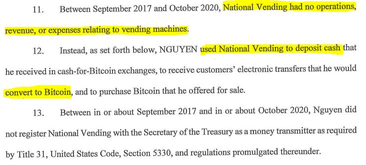 Departemen Kehakiman menyatakan bahwa Nguyen mengonversi lebih dari $1 juta ke Bitcoin dan sengaja tidak mendaftar ke Financial Crimes Enforcement Network (FinCEN) meskipun diwajibkan oleh peraturan Anti Pencucian Uang federal. Ia juga gagal melaporkan transaksi mencurigakan atau transaksi tunai lebih dari $10.000.