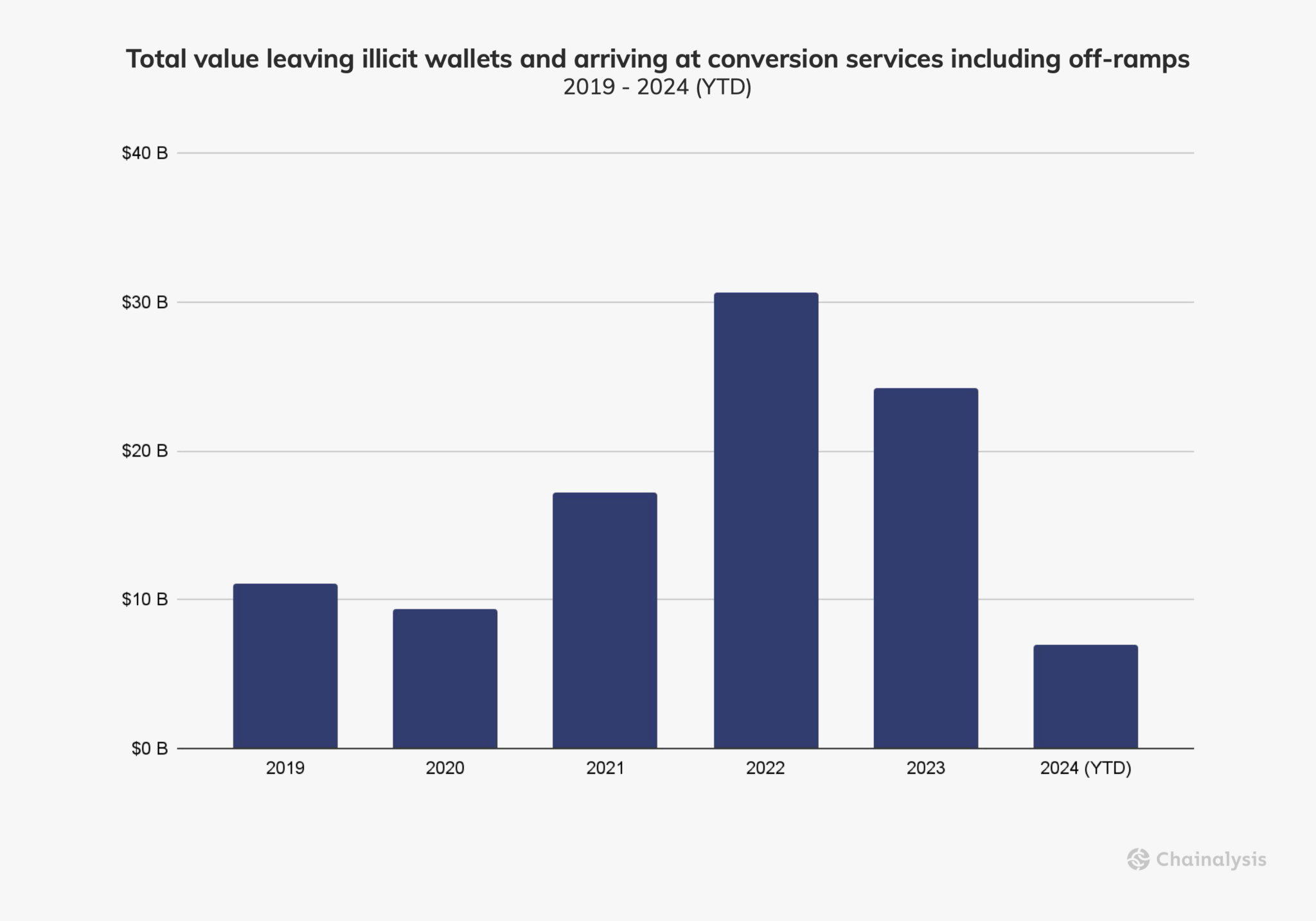 Chainalysis melaporkan lebih dari USD 100 miliar dalam kripto berpindah dari dompet ilegal ke layanan konversi sejak 2019 hingga pertengahan 2024.