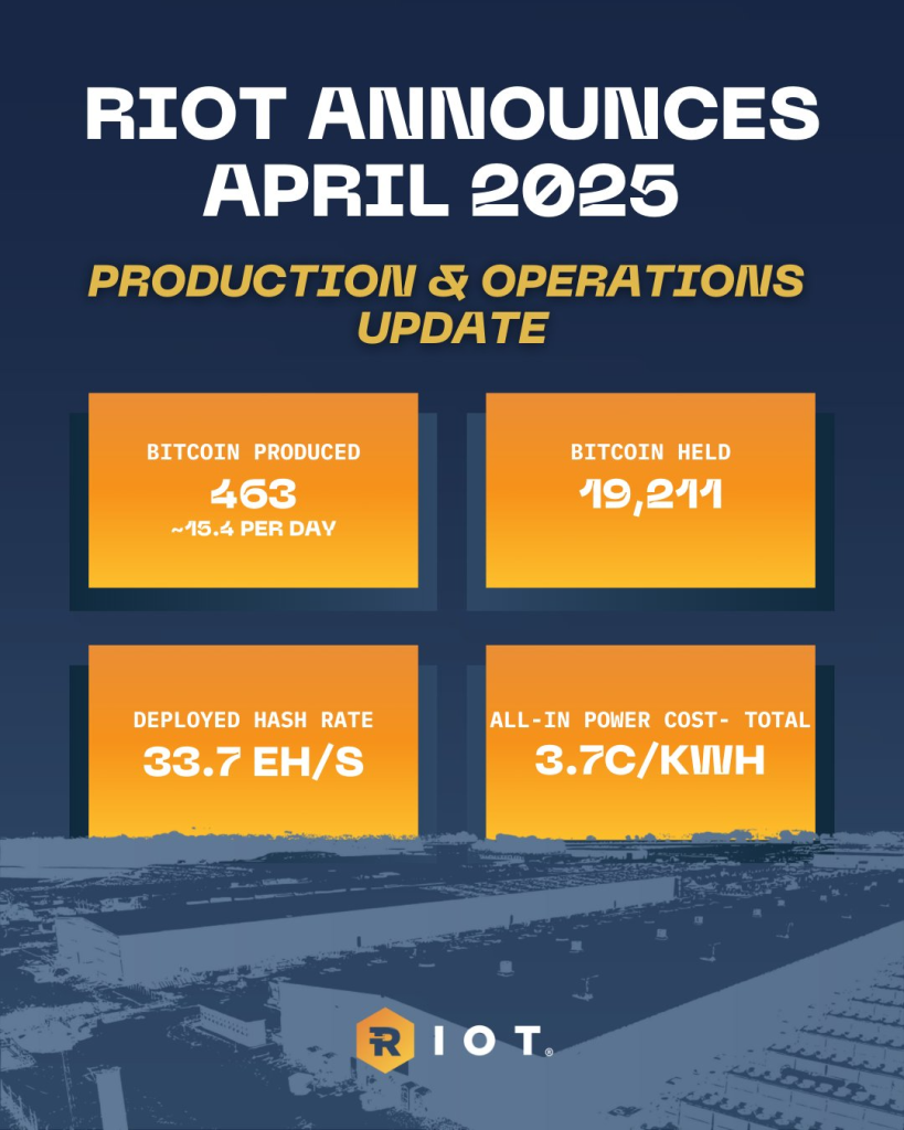 Riot menghasilkan 463 BTC pada April, turun 13% dari Maret karena dua kenaikan kesulitan jaringan Bitcoin berturut-turut. Namun, produksi masih naik 23% secara tahunan. Tingkat hash rate terpasang perusahaan tetap stabil di 33,7 EH/s, sementara rata-rata tingkat hash rate operasi sedikit menurun menjadi 29,3 EH/s.