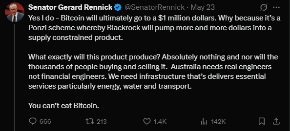 Senator Rennick Gerald berargumen bahwa Bitcoin pada akhirnya akan mencapai $1 juta, tetapi hal itu terjadi karena “BlackRock akan memompa lebih banyak dolar ke produk dengan pasokan terbatas.” Ia menambahkan bahwa Bitcoin “sama sekali tidak akan menghasilkan apa-apa” dan Australia “membutuhkan insinyur sejati, bukan insinyur keuangan.”