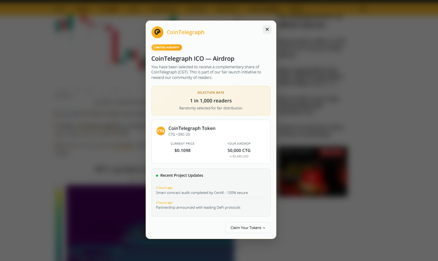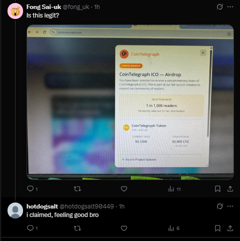 Terdapat laporan serangan pishing canggih yang menargetkan pengguna situs berita kripto Coinntelegraph.com di x. Pengguna menjelaskan bahwa pop-up tersebut berupa penipuan “klaim airdrop” yang sangat menjanjikan dengan nominal yang ditulis hingga $5 ribu USD dalam bentuk $CTG yang disebut oleh penipu adalah Cointelegraph Coin.
