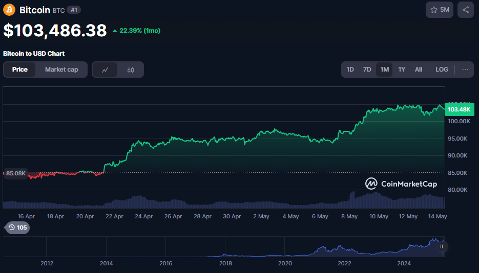 Saat ini harga Bitcoin berada di angka $103,475, menunjukkan kenaikan signifikan sejak sebulan yang lalu dengan kenaikan 22,41% dan dibersamai pembelian besar institusi di berbagai negara.