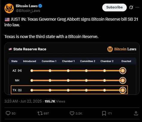 Texas baru saja membuat gebrakan signifikan di dunia kripto dengan menjadi negara bagian pertama di Amerika Serikat yang mendirikan cadangan Bitcoin yang didanai negara. Gubernur Greg Abbott menandatangani Senate Bill 21 menjadi undang-undang pada Sabtu lalu, menandai langkah besar menuju keuangan on-chain dan mengukuhkan posisi Bitcoin sebagai aset strategis.