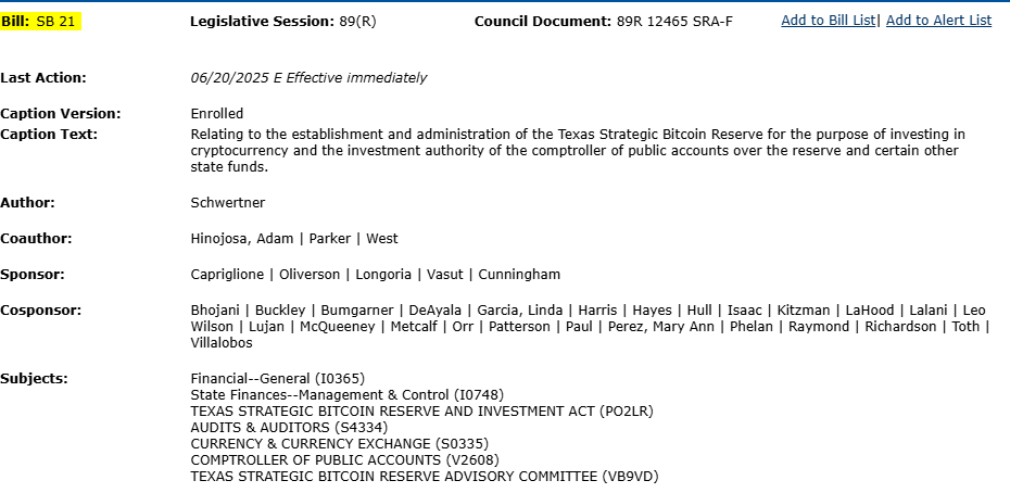 Gubernur Texas, Greg Abbott, baru saja mengesahkan Senate Bill 21 (SB21), secara resmi membentuk Texas Strategic Bitcoin Reserve. Dana yang dikelola negara ini akan menempatkan Bitcoin sebagai bagian dari aset keuangan jangka panjang Texas. Langkah ini menjadikan Texas negara bagian pertama di AS yang secara publik mengalokasikan dana untuk cadangan Bitcoin independen, bukan hanya sebagai bagian dari perbendaharaan umum.