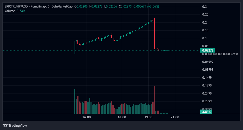 Sebuah memecoin bertema Eric Trump (ERICTRUMP) yang diluncurkan di platform Pump.fun Solana melonjak 6.200% dalam 24 jam, mencapai kapitalisasi pasar $140 juta pada 16 Mei 2025.