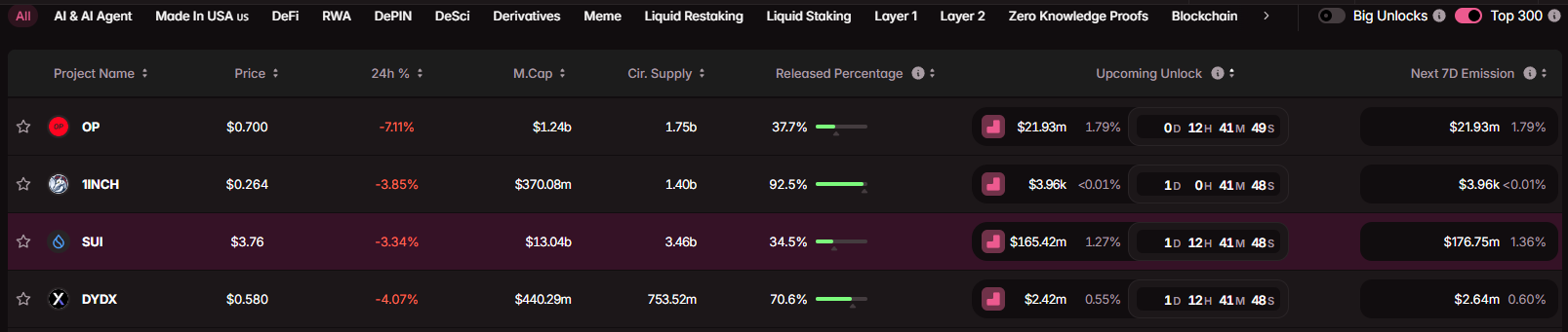 Gambar diatas adalah list token dari web Tokenomist, yang menunjukkan countdown token unlock. SUI menjadi perhatian utama dengan pelepasan token senilai $167,62 juta pada 1 Agustus. Dengan valuasi yang tinggi meskipun baru 34,5% pasokannya yang beredar, unlock SUI berpotensi menciptakan tekanan jual jika pemegang awal memutuskan untuk merealisasikan keuntungan. Sementara itu, Fasttoken (FTN) akan melepas $91,6 juta pada 18 Agustus. Namun, dampaknya diperkirakan minim karena lebih dari 94% tokennya sudah beredar di pasar. Proyek lain yang juga akan mengalami unlock pada pertengahan bulan termasuk Aptos ($51,5 juta), Avalanche ($40,35 juta), dan Arbitrum ($39,24 juta).