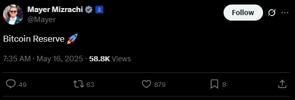 Meski tak merinci apapun dari isi diskusi, cuitan ini muncul jelang penampilan Mizrachi di konferensi Bitcoin 2025 di Las Vegas.