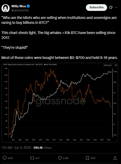 Dalam unggahannya di X pada 3 Juni, Woo menyebut bahwa mayoritas whale ini membeli Bitcoin saat harganya masih berada di kisaran $0 hingga $700 dan telah menyimpan aset mereka selama 8 hingga 16 tahun. Kini, mereka memanfaatkan momentum harga tertinggi untuk merealisasikan keuntungan.